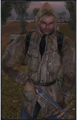 Petruhá va armado con una Escopeta Doble Cañón y posee una gabardina de cuero marrón.