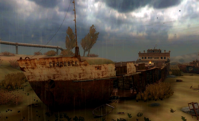 Vieille ombre rouillée de ce qu'il était avant la catastrophe, ce vieux bateau de transport a été converti par des stalkers sous le commandement du Barbu et du Hibou en un camp de ravitaillement complet, après l’arrêt du Lobotomisateur. Le Skadovsk est suffisamment robuste pour assurer la protection contre les émissions et dispose de quartiers rudimentaires, d’une infirmerie, d’une boutique et d’un bar. Il fournit même de l’éclairage électrique, grâce au vieux moteur du bateau qui a été restauré pour fonctionner correctement. Les parois et le pont du centre jusqu’à l’avant du vaisseau ont été pour la plupart arrachés, et la proue est presque brisée. L’entrée se situe à l’endroit où la moitié du bateau a été arrachée (notez que vous devez avoir rangé vos armes pour y pénétrer). Il existe une entrée secondaire, par le remorqueur à bâbord, montez sur le pont puis ouvrez la porte.