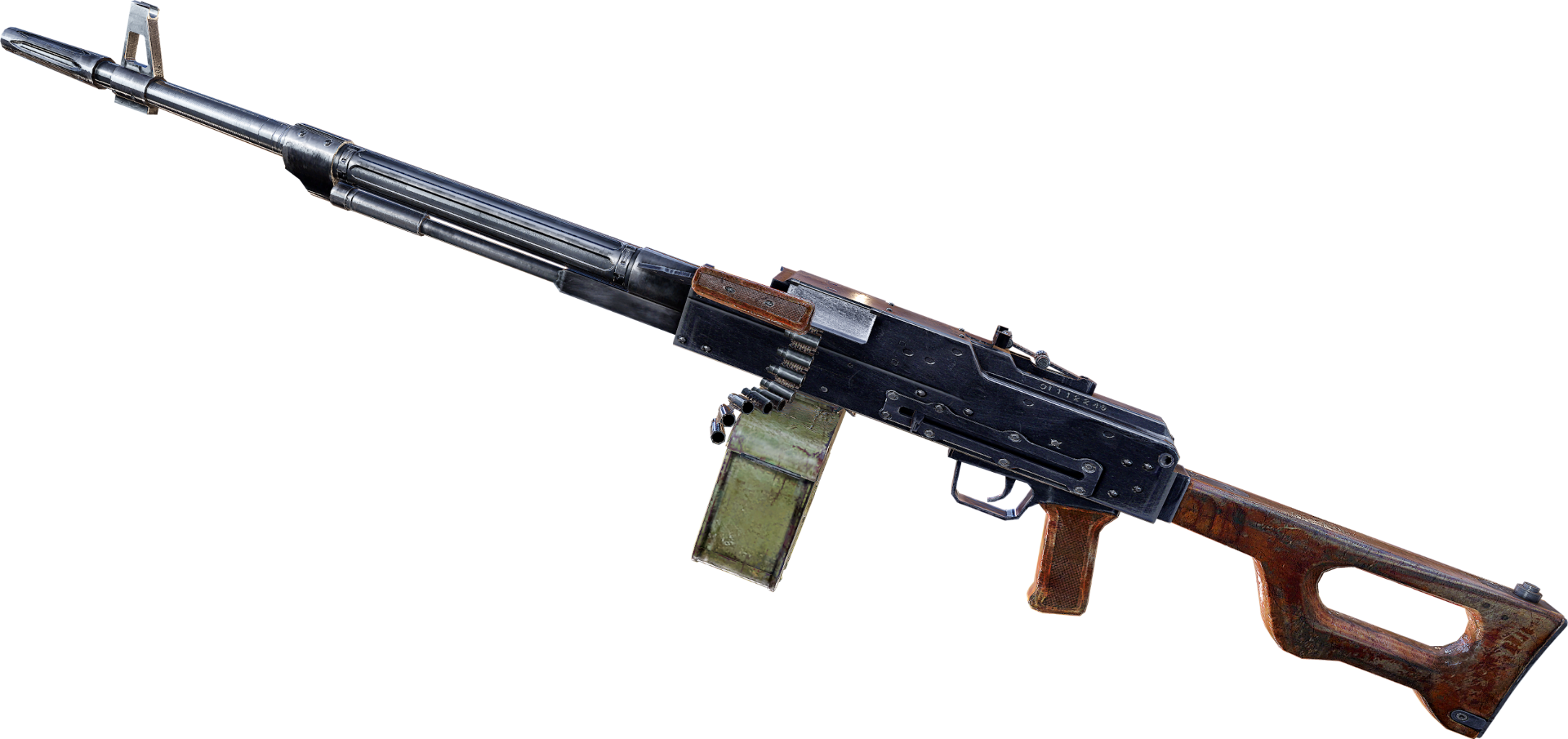 „Ten ładowany taśmowo karabin maszynowy to przenośna wersja ze złożonym dwuetapowym systemem ładowania. Mimo że jest ciężki i mało celny, znalazł w Zonie grono zwolenników. Używa się go głównie do walki z przeważającymi siłami wroga podczas konfliktów frakcji i do oczyszczania siedzib mutantów.”— Opis w S.T.A.L.K.E.R.: Zew Prypeci
