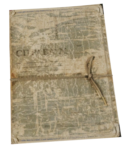Обвязанная верёвкой стопка старой пожелтевшей бумаги с завернувшимися краями. Верхний лист представляет из себя незаполненную обложку для справки на украинском языке, видна надпись «Справа №» (рус. «Справка №»). Внешняя часть документов полна потёртостей, текст тяжело различим.