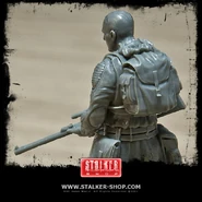 Пластиковая фигурка серого цвета высотой 8 см на пластиковом постаменте с надписью «Strelok». Изображает Стрелка в похожем на игровой комбинезоне со снайперской винтовкой ВСС «Винторез».