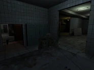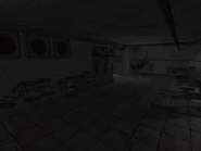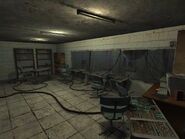 Если также идти налево, но позже повернуть направо, или просто идти прямо, то можно попасть в одну из таких залов, где находится медицинском оборудование, в том числе передвижные медицинские койки. Первые две медицинские комнаты соединены между собой одним из коридоров с решеткой на полу, а третий медицинский зал находится в правом крыле этажа и приурочена к одному из испытательных помещений и почти все оборудование из него вывезено.