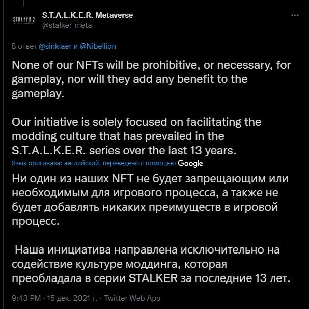 17 декабря, в 1:10 (по московскому времени), в официальном сообществе в «ВКонтакте» GSC Game World разместили запись, в которой они объяснили, почему решили связать игру с NFT, и какие были бы косметические внутриигровые нововведения. Но примерно через 10-15 минут запись удалили[прим. 3]. В 2:17 в том же сообществе появилась запись об отмене всего, что связано с NFT, так как большая часть поклонников была недовольна новостями о внедрении этой технологии[ссылка 14]. Аналогичное обращение, но в виде изображения, опубликовали на странице в Twitter[ссылка 15]. Предположительно, в этот же день удалена страница проекта в Twitter.