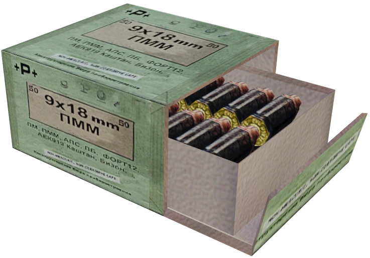 The 9x18mm cartridge is very common and cheap and readily available from most traders. The +P+ munitions have an overpressurized cartridge allowing for higher muzzle velocity. Due to the slug's weak integrity, they are not very effective against armored targets, but they deal just under twice as much damage in these cases compared to standard 9x18mm FMJ.