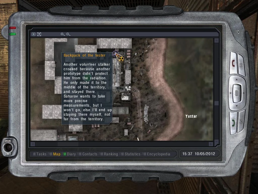 Another volunteer stalker croaked because another prototype didn't protect him from the radiation. He only made it to the middle of the territory, and stayed there. Saharov wants to take more precise measurements, but I won't go, else I'll end up staying there myself, not far from the territory.