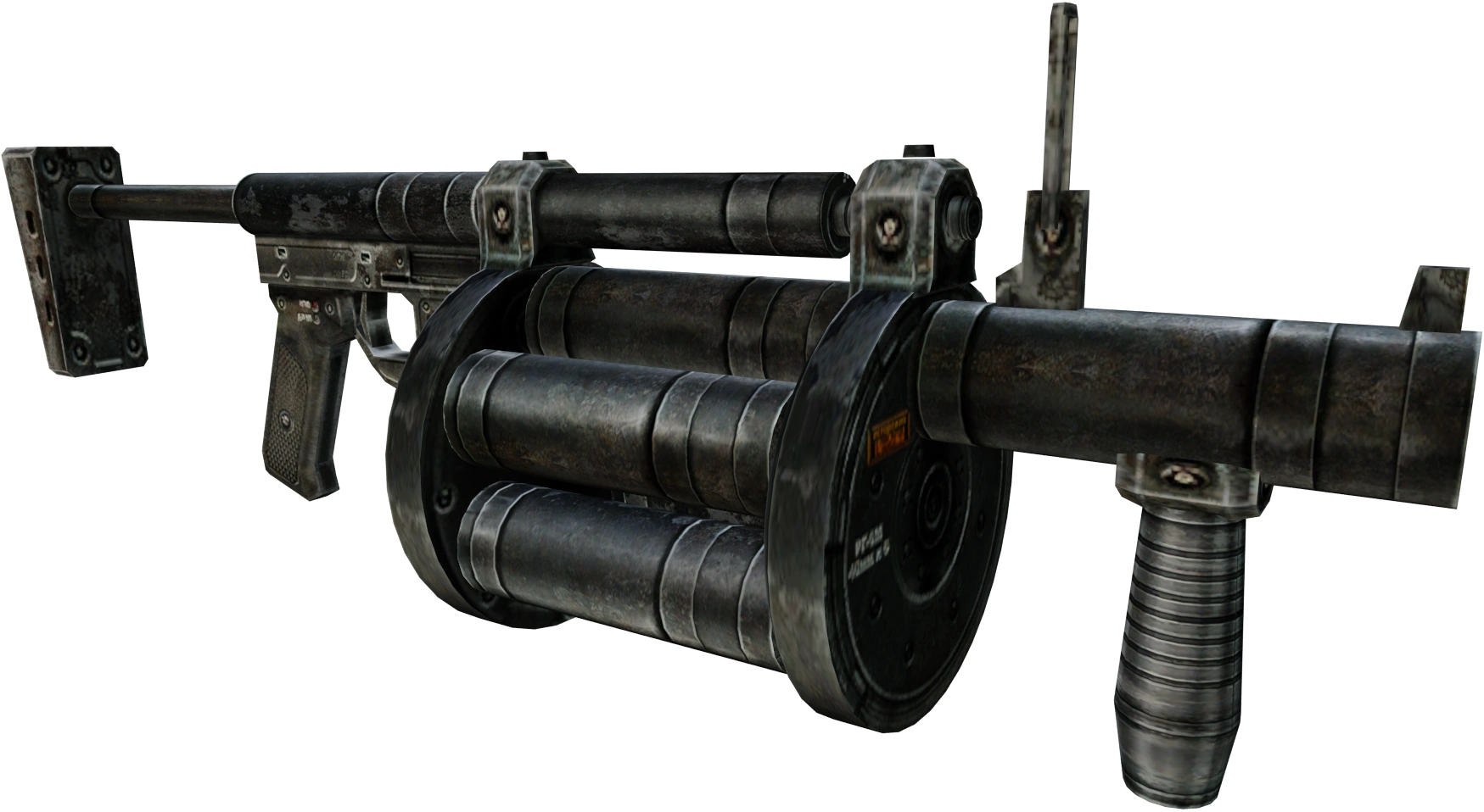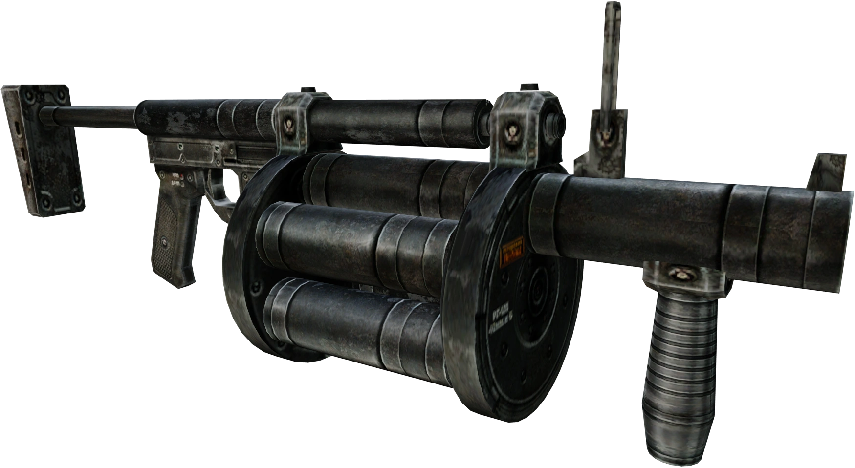 This revolver-type grenade launcher uses six rifled front-loading barrels, identical to underbarrel launcher attachments. The drum is also front-loading. Widely used for rapid suppression of enemy firing position and, when in the open, attacking defended fixed targets or fighting particularly tough monsters.