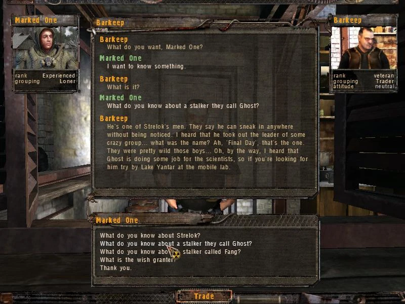 He's one of Strelok's men. They say he can sneak in anywhere without being noticed. I heard that he took out the leader of some crazy group... what was the name? Ah, 'Final Day', that's the one. They were pretty wild those boys... Oh, by the way, I heard that Ghost is doing some job for the scientists, so if you're looking for him try by Lake Yantar at the mobile lab.
