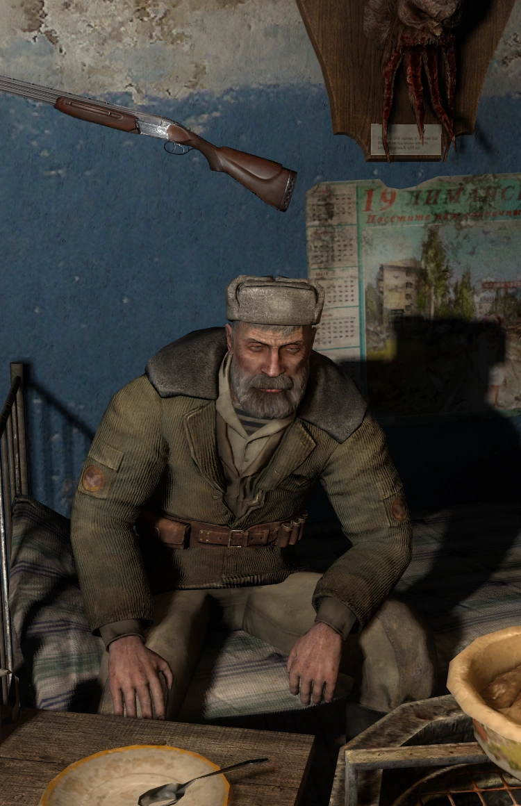 The Forester is an original resident of the Chernobyl area, who lived there long before the 1986 incident in a village near Limansk. He made a living as a park ranger in the Wormwood Forest (currently western Red Forest), alternating between tracking down poachers and guiding field trips. When the Chernobyl power plant exploded, he refused to be evacuated and stayed behind.[1] After the second explosion at the station, he discovered his ability to sense and bypass anomalies. With the help of a Compass artifact he found, he was able to escape from a Space Anomaly, something that STALKERs cannot do.