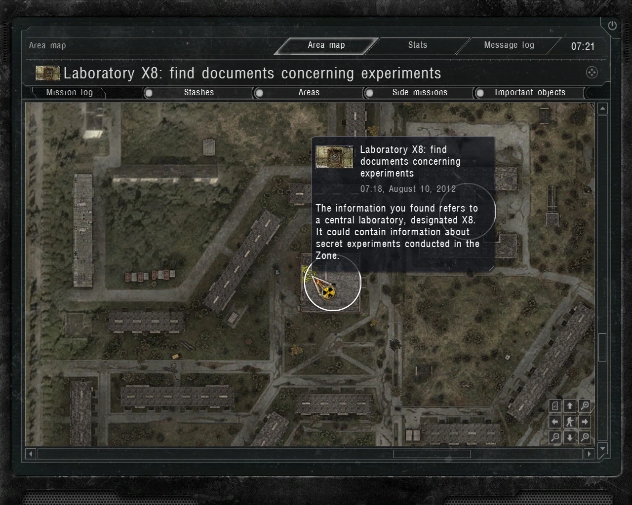 This mission is acquired by completing Item 62: find documents in the testing workshop. The Major's investigation leads him to the Documents concerning item 62 which mention a laboratory designated X-8 related to secret experiments in the Zone. The document also contains the Yellow X8 keycard which grants access to the laboratory.