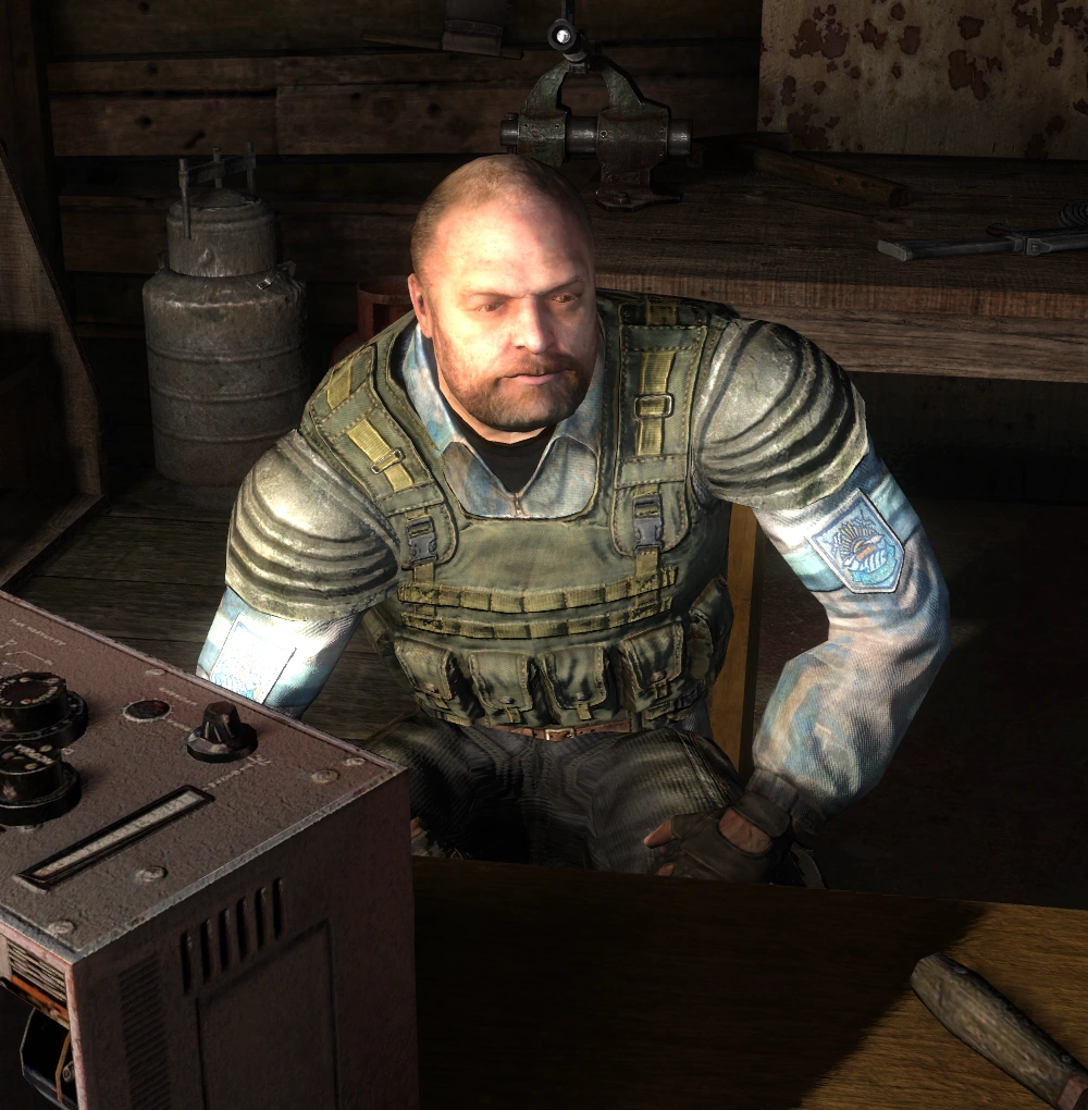 Unlike in Clear Sky, he is not quite as useful a technician - he can not upgrade weapons as the Ecologist's mobile laboratory lacks the necessary materials and he initially cannot perform any upgrades whatsoever to armor or helmets. Completing the mission Intermittent psy-emissions will enable him to install some upgrades that improve the player's psi-protection, and completing the mission Anomaly research will enable him to upgrade the player's armor with a number of modifications that boost their resistance to anomalies. Some of these upgrades, such as the Sphere M12 helmet's tier 3 radiation/chemical protection upgrade, are exclusive to him.