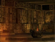 The temple was not created entirely from scratch. For example, the spiral staircase, parts of the ornaments, the hippopotamus statue, and some textures were taken from the old map — l1_day. On November 25, work on the temple was completed, and the creation of flora for the location began. On December 1, the road with columns near the temple was ready, and a little later work on the basic flora of the location was finished. On December 11, underground passages were created. On December 21, Sergey Karmalsky created surrounding structures. Two days later, he created a torch model and placed them with light sources around the temple. On December 26, he stepped away from refining the demo level and made a prototype of one of the tiers of the multi-level city of the future, resembling something like an administrative building. Two days later, he recreated the game design of the temple's surroundings. Added were fuel vases, torches, and in flora — an abundance of ferns and burdocks, willow-like trees, and hanging vegetation appeared.