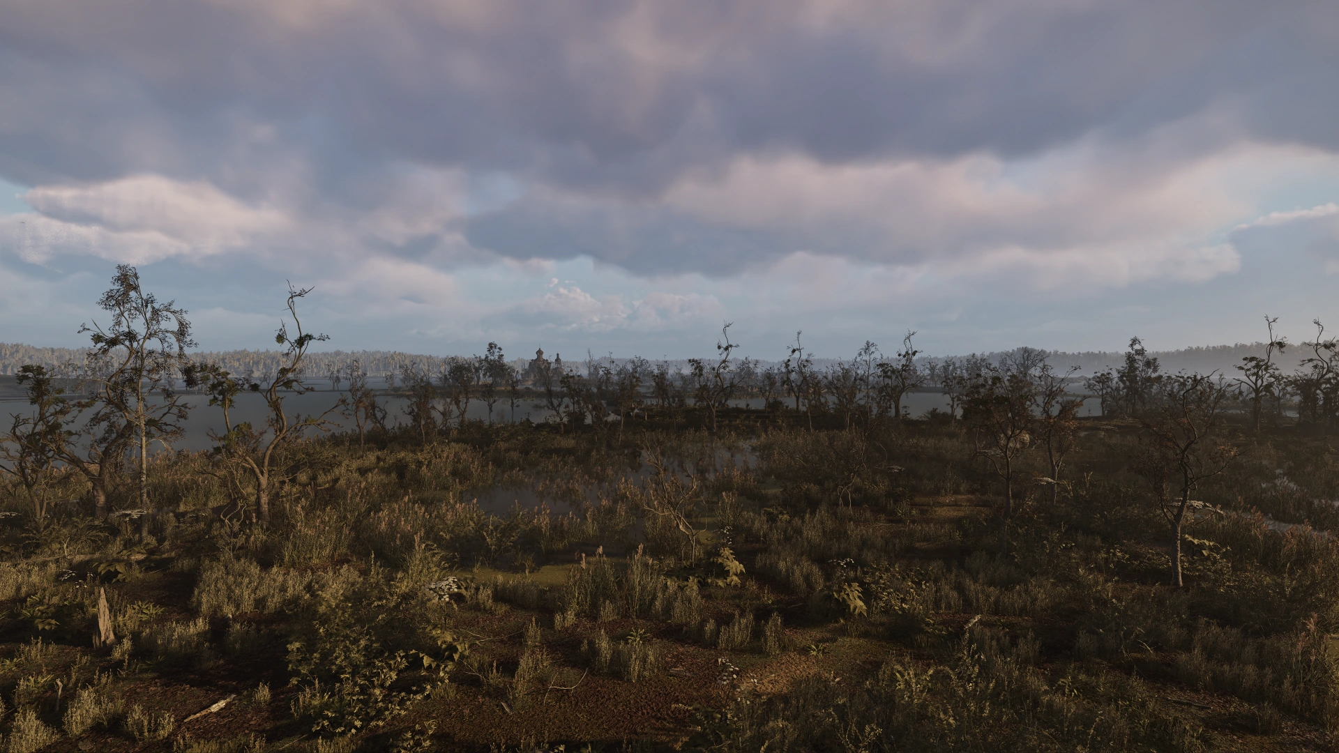 The marshlands consist mostly of murky irradiated water and tall reeds, with thin passages of safe land stretching like labyrinthine bridges all over. A few abandoned buildings and settlements dot the landscape.