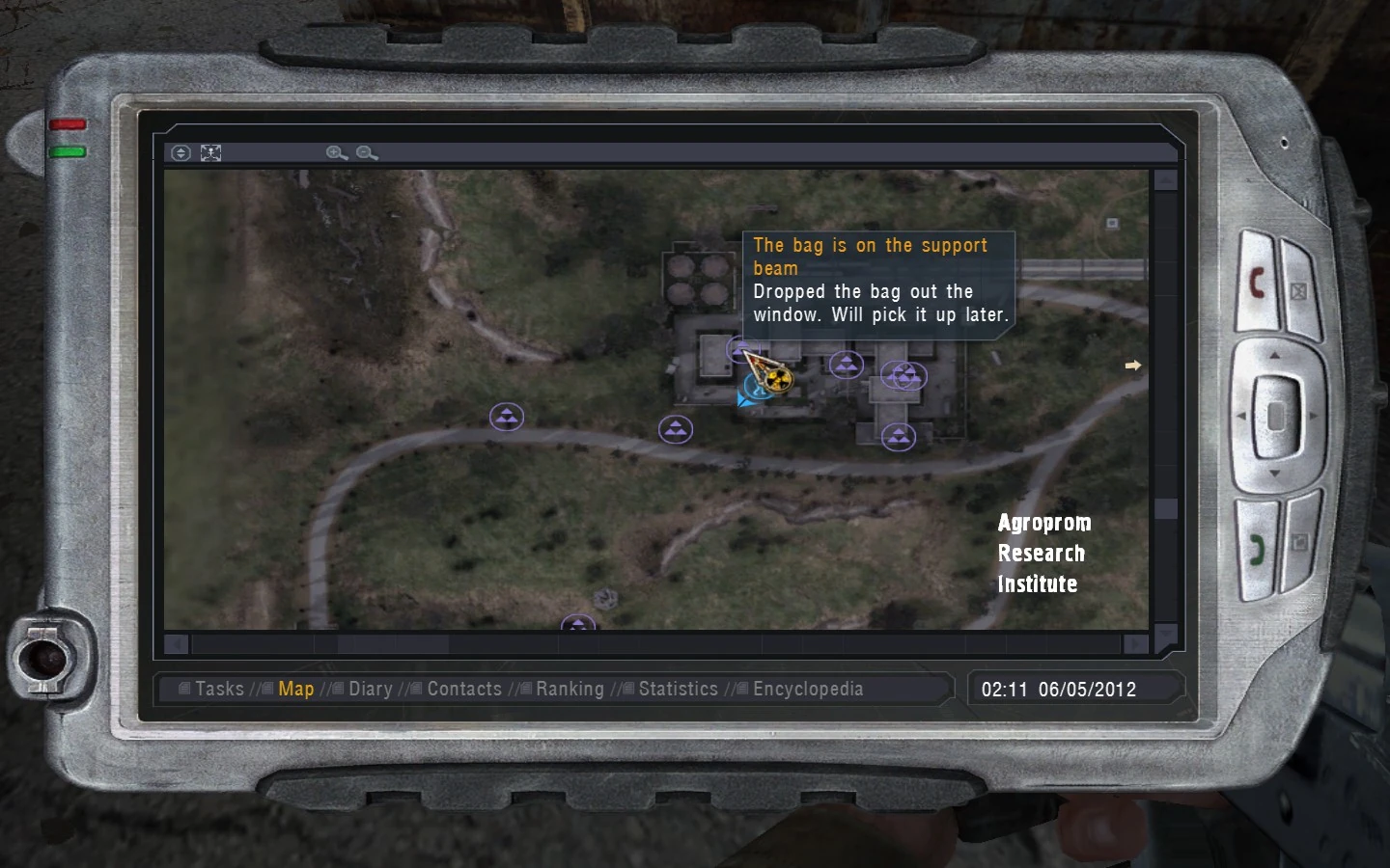 The simplest way to approach this stash is by climbing the ladder onto the roof of the factory at the far western end of the complex. It is the only ladder visible from the entrance to the Agroprom Underground. Once on the roof, the player can climb down inside the building and along the skywalk between the two buildings. The stash is on the southern side of the skywalk, on the support beam, strangely enough!