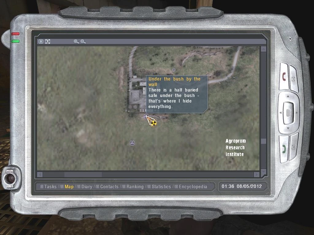 The safe is found to the south of the Agroprom Research Institute, hidden underneath a bush located next to a Vortex anomaly. The coordinated of the stash are given upon finding the corpse of any random Loner stalker.